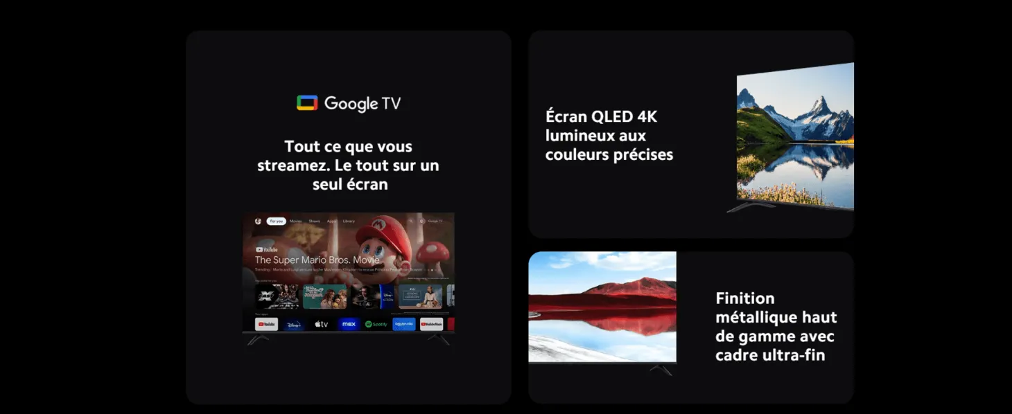 Équipée de Google TV™, cette smart TV propose Netflix, Prime Video, YouTube préinstallés et un accès à des milliers d’applications via Google Play. Avec l’Assistant Google intégré, Chromecast built-in™, AirPlay, Miracast, et Bluetooth 5.0, la TV devient le centre de votre maison connectée.